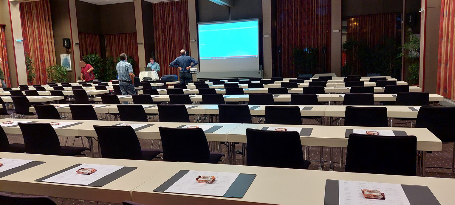 Am Vorabend wird der Saal vorbereitet und mit Referenten getestet.