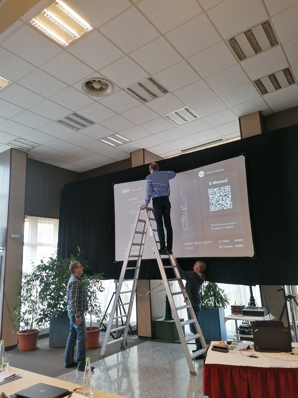 In der Pause der Billigkonferenz wird waghalsig repariert. Philipp und Bernd assistieren.